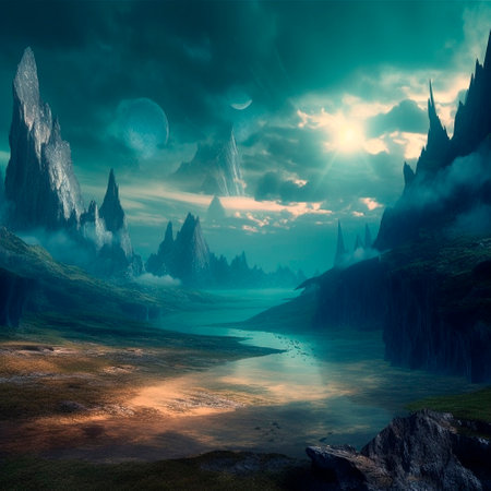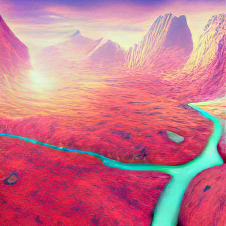 Fantasy landscape with river and mountains in the background. 3d rendering