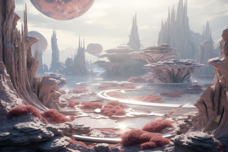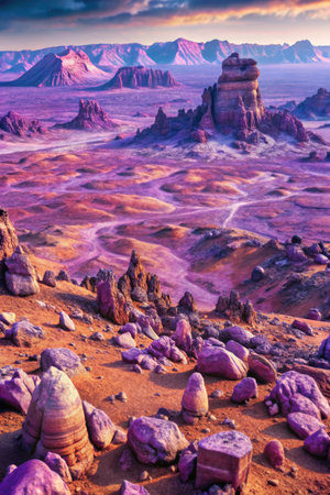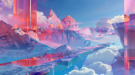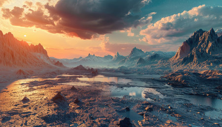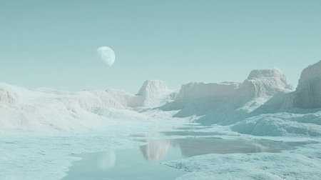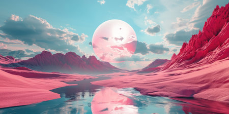 a beautiful desert landscape in the style of futuristic sci-fi aesthetic, captured in 8k 3d. this classical landscape, inspired by isaac levitan, features a mesmerizing combination of light pink and light indigo hues. the use of anamorphic lens adds depth to this photorealistic depiction of the desert. ai generated
