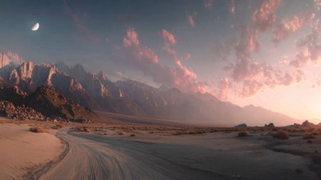 Sweeping vista of a desert landscape featuring a winding road that leads to a mountainous horizon. The sky is painted with colors of sunset, with soft pink and warm golden hues. A crescent moon is visible in the upper left portion of the image. The desert floor is covered with sand and sparse vegetation, while the mountains rise in the background, showing a mixture of light and dark tones.