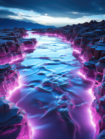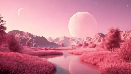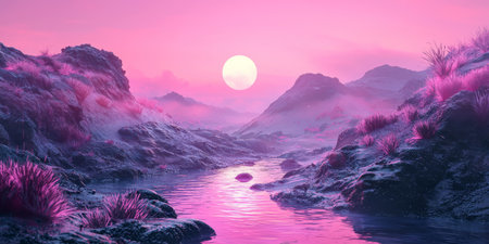 fantasy valley with rolling hills and crystal-clear river, under a pink sky. Generative AI
