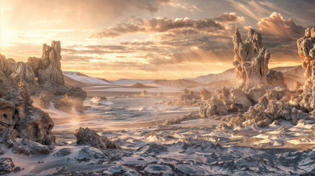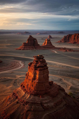 A breathtaking view of a desert landscape showcases tall rock formations bathed in warm sunlight at dusk.