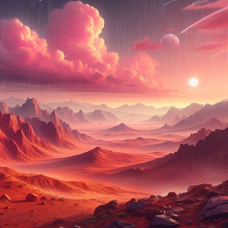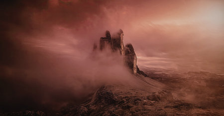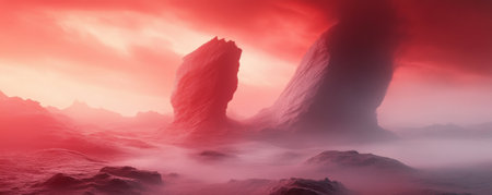 Mysterious red rock formations in a misty alien landscape, surreal nature concept