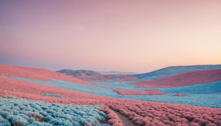A panoramic view of rolling hills with a vibrant pink and blue hue, taken at sunset