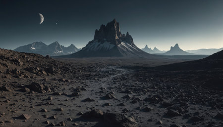 A crescent moon hangs in the night sky over a desolate, rocky landscape