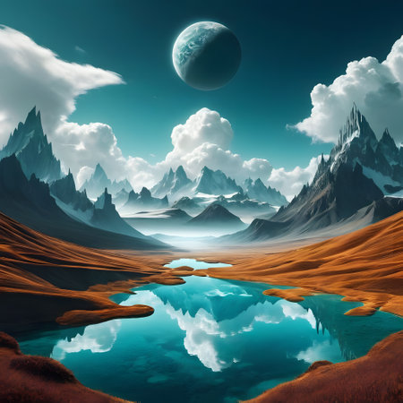 Fantasy alien planet. Mountain and lake. 3D Rendering