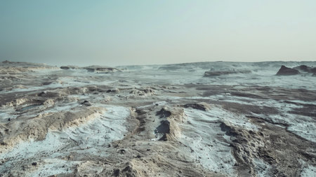 The image shows a desolate landscape with no vegetation, only snow covering the ground. The lack of plant life and the presence of snow create a stark and cold scene.