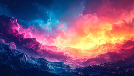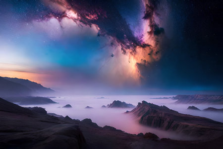unreal breathtaking natural landscape at night , mountains and starry sky with glowing nebulae