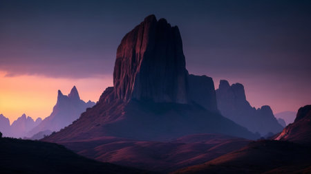 Dramatic landscape at sunset, with rock formations and a stormy sky.