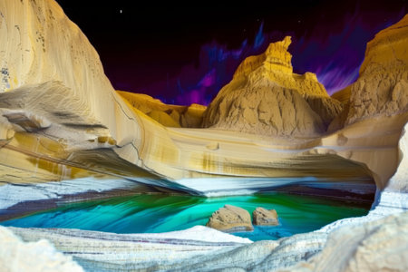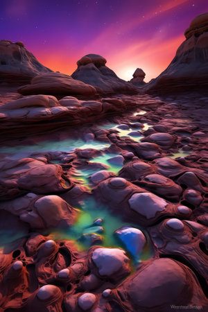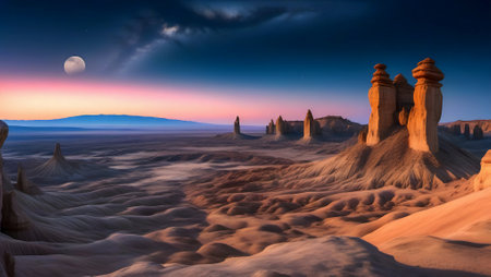 Generative AI : Spectacular scenery of rough rocky formations with uneven surface and wavy lines under starry sky in Toadstool Hoodoos