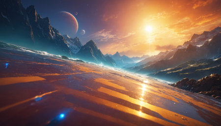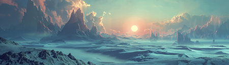 An alien sunset landscape, with bright colors illuminating the icy surface and jagged mountain peaks under an otherworldly sky. The poster