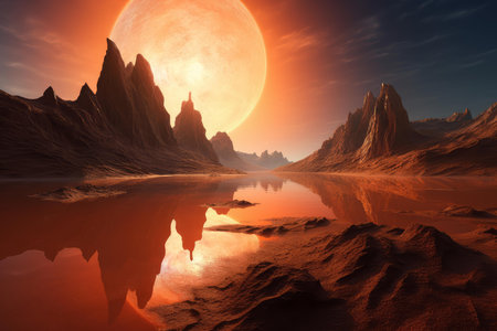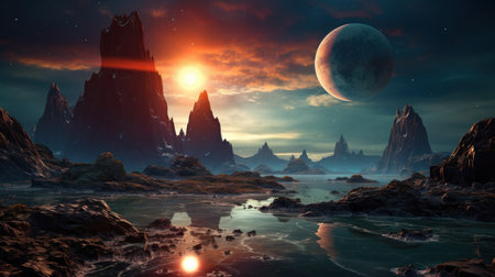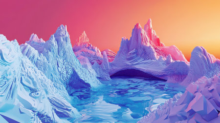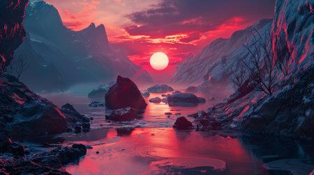 Landscape panorama with rocks and water in 3D. Abstract fantastic background. Red sunset light illuminates the landscape.