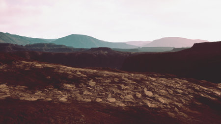 A vast volcanic terrain stretches out, showcasing rugged rock formations and gentle slopes. Distant mountains rise under a soft, glowing sky, creating a serene yet powerful atmosphere.