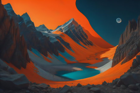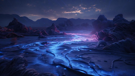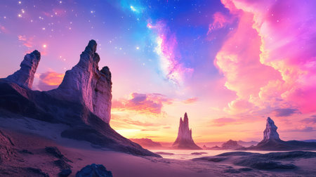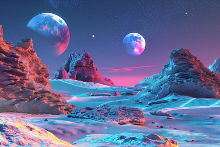 Fantasy landscape. Colorful mountains at night. 3D illustration