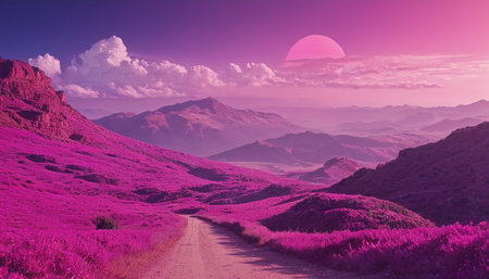 Beautiful fantasy landscape with pink meadow and mountain road at sunset