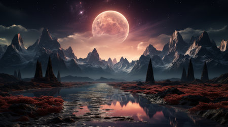 Fantasy landscape with towering cliffs and a glowing moon in the background. Generative AI