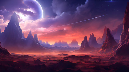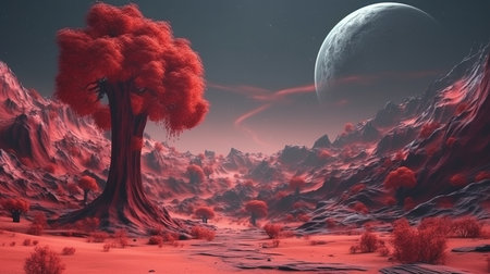 Breathtaking alien world with canyons, a lonely tree and a purple sky illuminated by giant planets