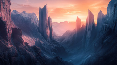 A breathtaking landscape featuring towering mountains lit by a radiant sunrise. The serene valley below, enhanced by vibrant colors, evokes tranquility and beauty, perfect for nature lovers.