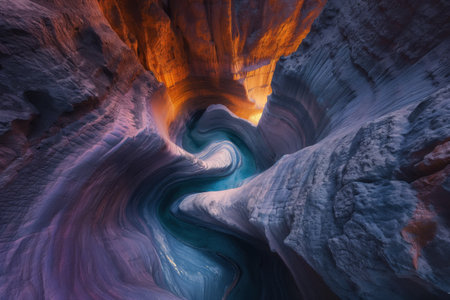 Narrow, winding canyon with colorful, sculpted walls is illuminated by golden light as turquoise water flows through it