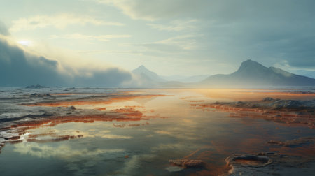 a stunning uhd image capturing a post-apocalyptic landscape with soft edges and atmospheric effects. the photo showcases the land surrounding a lake and mountains, bathed in a beautiful blend of light orange and light aquamarine hues. this photobashing masterpiece combines environmental portraiture with lively coastal landscapes, creating a captivating scene. ai generated