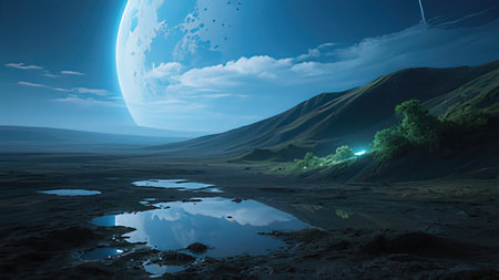 Fantasy alien planet. Mountain and lake. Night sky. 3D illustration