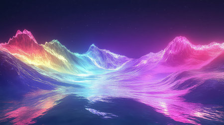 Glowing rainbow mountains reflecting vibrant aurora colored water