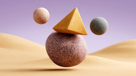 Matte pyramids and spheres with subtle texture, arranged in a minimalist composition,3D Generative AI