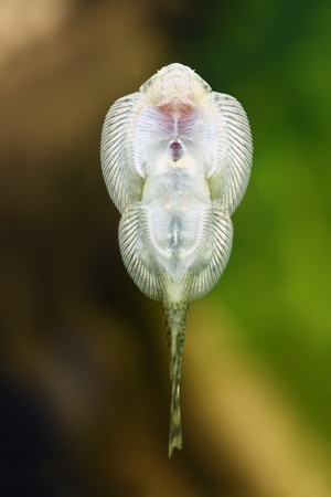 Small catfish Corydoras frontal closeup with blurred natural background.