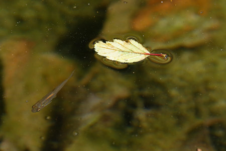 Dead leaf floating in water with small fish autumn theme