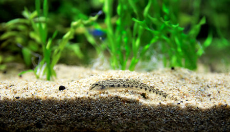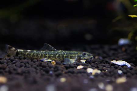 A detailed view showcases an aquatic creature with a speckled pattern and prominent whiskers. The fish is viewed in an underwater environment, with vegetation and small stones. The lighting suggests indoor conditions. This image is suitable for various commercial purposes, including educational materials and design projects.