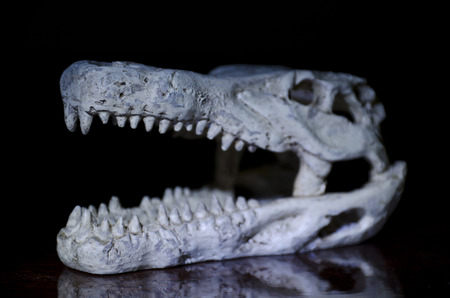 Detail of a mouth full of sharp teeths of a skull fossil of an ancient dinosaur