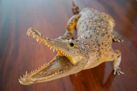 Snapshoot of crocodile. Caiman yacare - small-mid sized crocodilian from alligator family. Caiman crocodilus, reptile head with open jaws