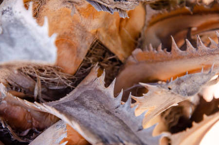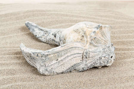 close up detail of damaged seashell in sand