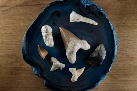 different shark teeth on agate stone, top view