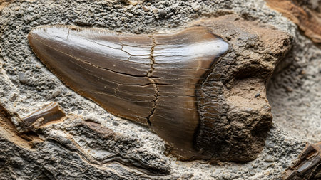 Magnificent fossilized megalodon shark tooth perfectly preserved in ancient sedimentary rock