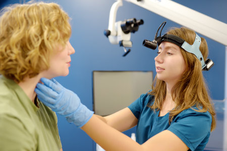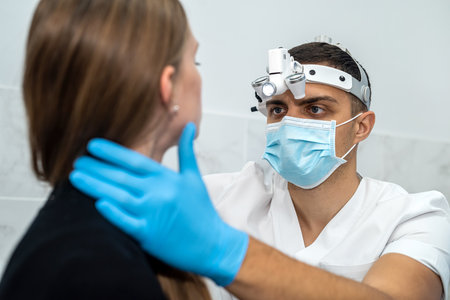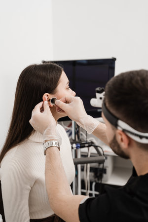 lateral view of a male otolaryngologist examining the ear of a female patient