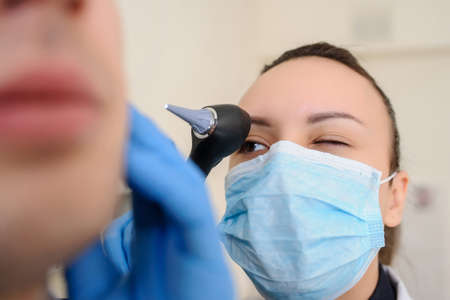 Otoscopy of ears with ear funnel. ENT doctor with otoscope. Consultation with otolaryngologist. Treatment of woman ear pain