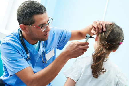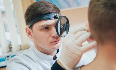The ENT doctor, an otolaryngologist, diagnoses the ear of the patient. Wipes otitis media or ear plug
