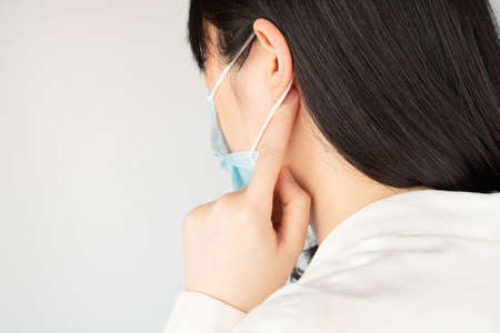 Woman touching backs of her ears and suffering from ear pain that caused by wearing medical face mask, result in skin irritation or contact dermatitis.