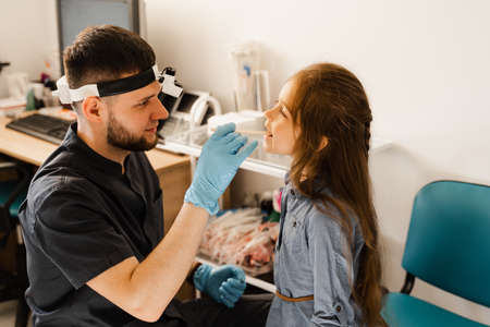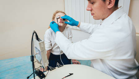 Portrait of an otolaryngologist while working with a girl patient on an examination of the sinuses. nasal congestion medicine