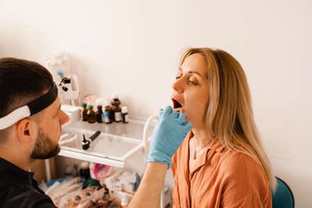 Oropharyngoscopy procedure. Otolaryngologist examines woman throat with spatula. Consultation with laryngologist