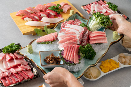 Japanese food sushi tuna with nori in the restaurant, Sashimi raw tuna menu set Japanese cuisine fresh ingredients on tray, selective focus