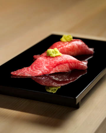 Fatty Tuna Sushi fillet with wasabi on black platter