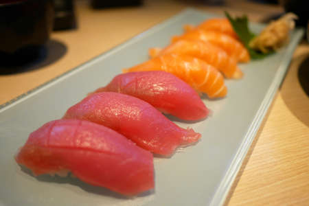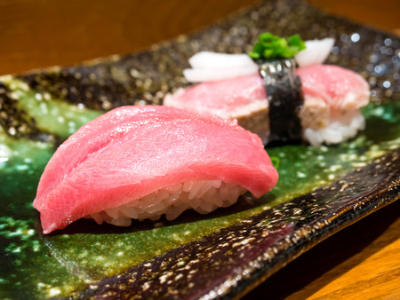 Close up Otoro sushi or tuna blue fin sushi on the plate in japanese restaurant.