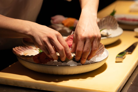 Closeup of chef hands preparing japanese food. Japanese Omakase Restaurant counter