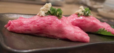 Wagyu beef sushi, focus on the front