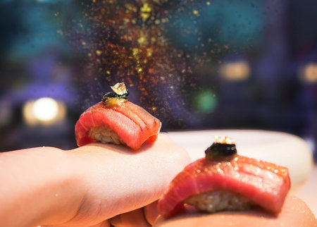 Expert hands delicately place edible gold leaf on a beautifully prepared tuna nigiri sushi