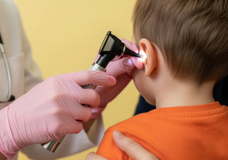 Doctor examines a child ear with an otoscope. medical professional wearing pink gloves checks the ear of a young boy. healthcare setting with examination equipment.