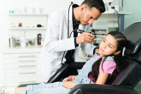 Ill little girl visiting a pediatrician due to an ear infection. Male otolaryngologist checking the ear of a small kid with hearing problems
