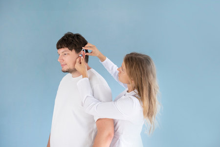 young male patient testing hearing aid in clinic exam room, young female doctor helping