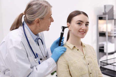 Otolaryngologist or ENT physician doctor examining patient ear with otoscope.